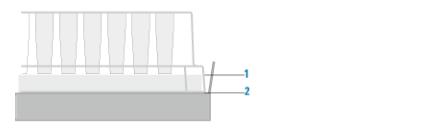 As the figure shows, the height difference between the adapter top (1) and the plate nest top (2) enables a skirted microplate to nest in the station. The well bottoms must sit directly on the adapter top to enable an efficient temperature transfer. However, the teachpoint must account for this height difference to ensure that the Bravo robot grips the microplate at the correct position and performs pipetting tasks at the correct height.