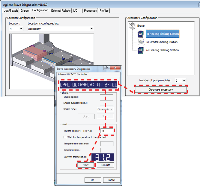 3 In the Accessory Configuration area, select the Heating Shaking Station, and then click Diagnose accessory.