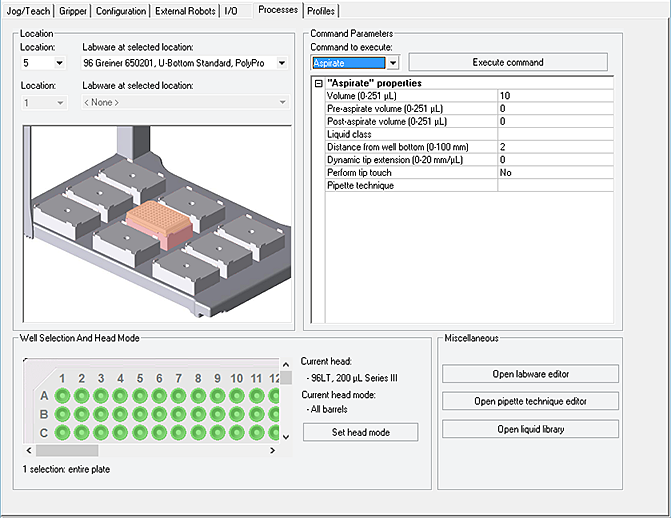 c To start the process, click Execute command.To stop a process before completion, click Stop motors to stop the movement of the Bravo head. To re-enable the motors, click Enable all motors on the Jog/Teach tab.
