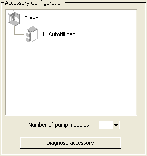 Displays icons of the Bravo Platform and any configured accessories associated with specific deck locations. Specifies the total number of Pump Modules for the given Bravo Platform. Each Pump Module contains two peristaltic pumps.
