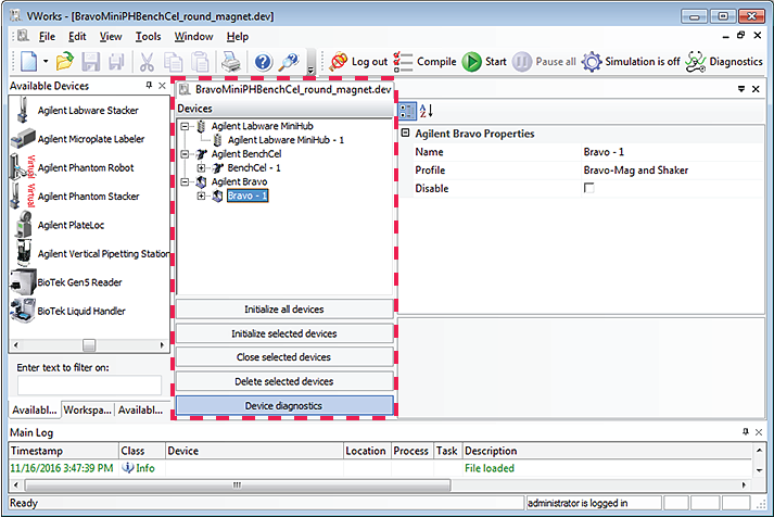 • VWorks window. To use VWorks to control the device, for example, to run a protocol, you initialize the devices in the VWorks window.