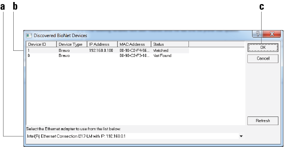 b In the list of devices that appear, select the Bravo device. If multiple Bravo devices are on the network, use the MAC Address to identify the Bravo device for this profile. To successfully communicate with the Bravo device, the Status column must display New or Matched.