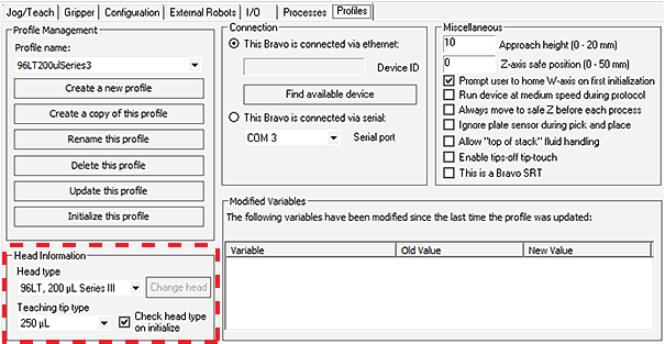 c Ensure that the Check head type on initialize check box is selected.Note: If the Check head type on initialize check box is cleared, the w-axis controls in the Jog/Teach tab will be disabled even when the device is initialized.