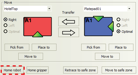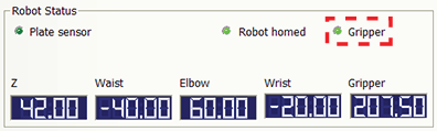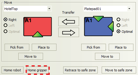 In the Jog/Move tab, click Home grippers. The robot opens and closes its gripers until it finds the home position.