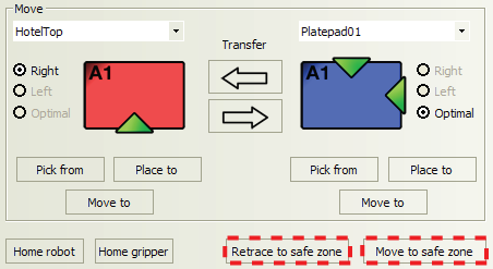 In general, the Direct Drive Robot moves into the safe zone after it completes a Move to, Pick from, Place to, or Transfer command. However, you can move the robot into the safe zone at other times to move it out of the way.