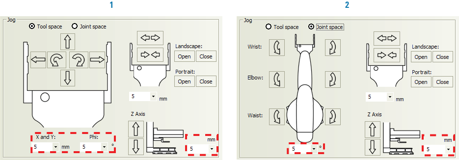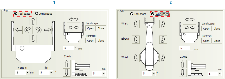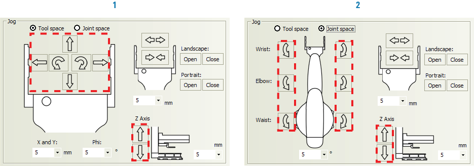The Direct Drive Robot movements can be controlled or monitored from two different perspectives: