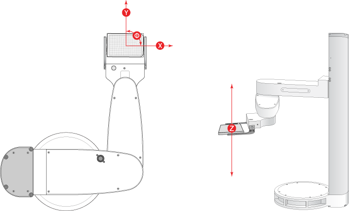 • Tool space. You can use a tool-space command to move a combination of robot joints so that the labware moves to its target location along the x-or y-axis. In addition, you can rotate the labware (Phi angle) and move the robot arm up and down along the mast or z-axis. In tool space, all movements are measured with respect to the center of the labware.