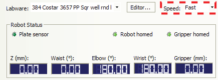 Note: During a protocol run, the robot will use the speed selection in the VWorks software Tools > Options dialog box. If the robot is holding a microplate, the slower of the following will be applied: the speed in the Labware Editor or the speed in the Tools > Options dialog box. For more information, see the VWorks Automation Control Setup Guide and VWorks Automation Control User Guide.