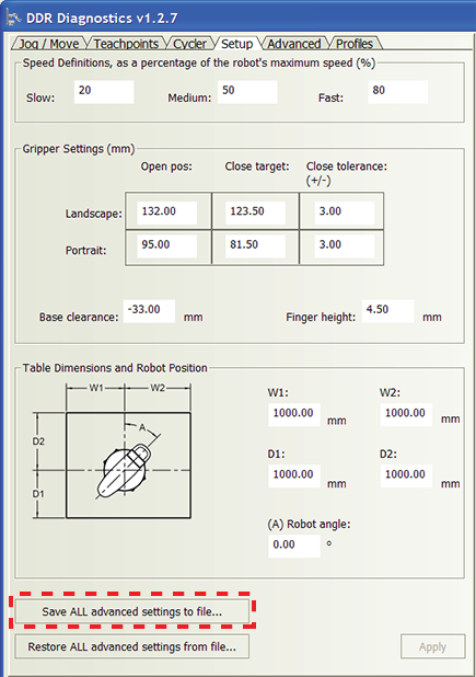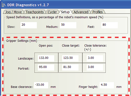 2 In the Gripper Settings area, type the new values you want to use for Open pos, Close target, and Close tolerance.