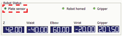 Checking the robot microplate sensor The microplate sensor under the robot hand is used to detect the presence of labware in its grip. If you suspect that the microplate sensor is not working correctly, you can check to see if it requires recalibration. To check the microplate sensor: 1 Move the robot to a teachpoint that has a labware. 2 Move the robot up so that it is at the correct robot gripper offset for the labware. 3 Close the gripper. 4 Move the robot away from the teachpoint. The microplate sensor is highly sensitive and might detect the plate stage or platepad as labware. Moving the robot away from any teachpoint would provide the most accurate detection result. 5 In the Robot Status area, check the Plate sensor indicator. If the indicator light is on, the microplate sensor is detecting a labware in its grippers. If the indicator light is off, the microplate sensor is not detecting labware. Contact Automation Solutions Technical Support to see if the sensor needs to be recalibrated. 6 Open the gripper to release the labware. Related information For information about... See... Homing the robot Homing the robot and grippers Moving the robot into the safe zone Moving the robot into the safe zone Disabling and enabling the robot motors Disabling and enabling the robot motors Changing the robot speed Changing the robot speed Stopping the robot motors Stopping the robot motors Jogging the robot Jogging the robot Opening and closing the robot grippers Opening and closing the robot grippers Changing the robot display Changing the robot display Viewing the log area Viewing the DDR Diagnostics log area