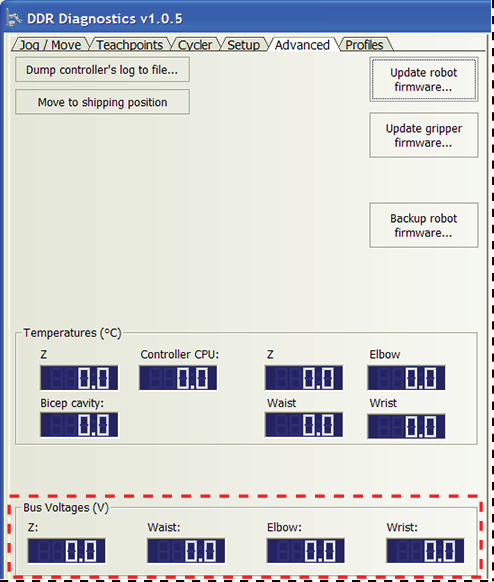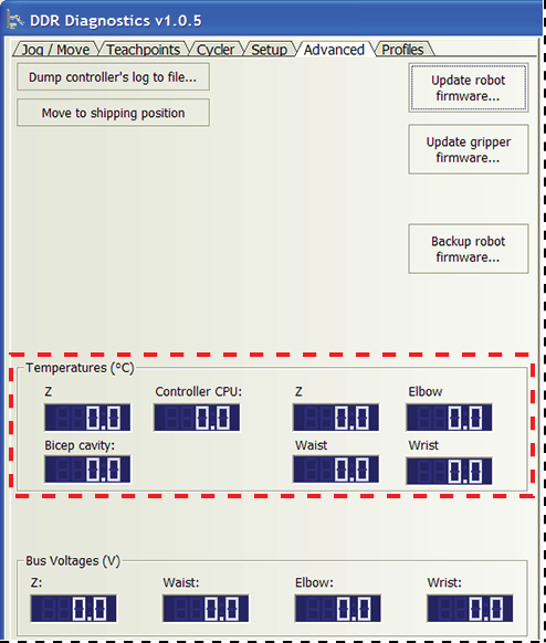 If the any of the temperatures rise above the factory-set threshold value, the robot will shut down and display an error. If this happens, contact Automation Solutions Technical Support.Voltages delivered to robot motors are displayed in the Advanced tab. The values are updated every 2 seconds.