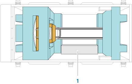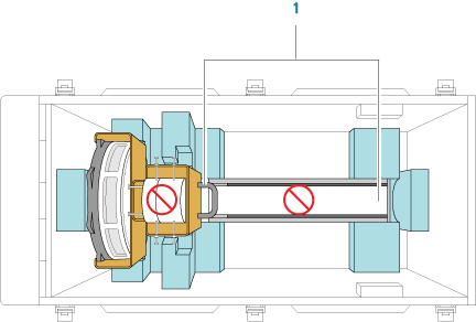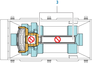 2 While holding the handle on the shipping brace and supporting the robot under the mast (1), carefully lift and place the robot in the crate as shown.