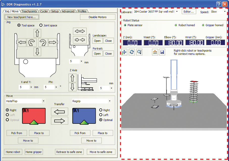 Robot status area Selection or command Description Labware Allows you to select a labware. Editor Opens the Labware Editor. Speed Sets the robot speed: Slow, Medium, or Fast. Plate sensor Indicates the presence of labware in the robot grippers. If the indicator light is on, a labware is in the robot grippers. If the indicator light is off, the sensor does not detect a labware in the robot grippers. Robot homed Indicates that the robot is in the factory-defined home position. Gripper homed Indicates that the robot grippers are in the factory-defined home position. Z (mm) Displays the current z-axis coordinate relative to the home position. Waist (°) Displays the current waist coordinate relative to the home position. Elbow (°) Displays the current elbow coordinate relative to the home position. Wrist (°) Displays the current wrist coordinate relative to the home position. Gripper (mm) Displays the current distance between the two grippers. Pans, or moves the image. Click the button, and then drag the image in the desired direction. Rotates the image. Click the button, and then drag the image to rotate it in the desired direction. Alternatively, click the middle mouse button or wheel, and then drag the image to rotate it. Increases or reduces the image magnification. Click the button, and then drag the image upward or downward to increase or decrease the magnification respectively. Alternatively, scroll the mouse wheel to change the magnification. Resets the image to the default view. Saves the current view as the default view.