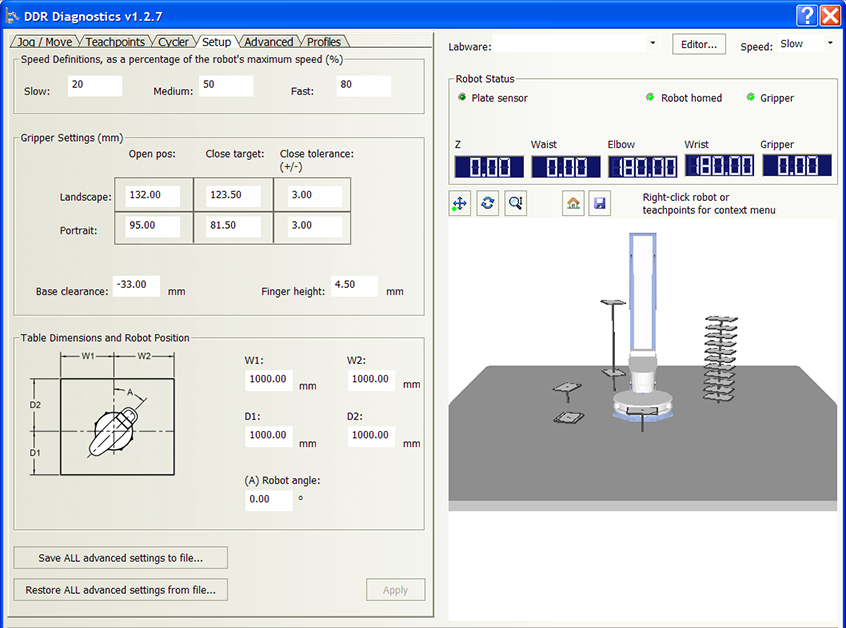 Setup tab Speed definitions The following robot speeds are definable as a percentage of the factory-set maximum speed. The default percentage settings are as follows: Speed Default Slow 20% Medium 50% Fast 80% Gripper Settings (mm) Command or option Description Open pos The distance, in millimeters, between the grippers when they are open. The default values are 132 mm (landscape) and 95 mm (portrait). Close target The approximate distance, in millimeters, between the grippers when they are closed. The default values are 123.5 mm (landscape) and 81.5 mm (portrait). The Close target value is always used in conjunction with the Close tolerance value. Close tolerance The distance, in millimeters, the Close target is allowed to vary without causing an error. The default value is +/-3 mm. Base clearance The z-axis coordinate at which the bottom of the grippers touches the top of the base. Finger height The height of the grippers, measured from the midpoint of the gripper pads. Table dimensions and Robot Position Command or option Description W1/2 The width of the robot-attachment surface. W1 and W2 specify the lengths of the two segments of the width. The line that intercepts the end of W1 and the beginning of W2 runs through the center of the robot base. D1/2 The depth of the robot-attachment surface. D1 and D2 specify the lengths of the two segments of the depth. The line that intercepts the end of D1 and the beginning of D2 runs through the center of the robot base. Robot angle The angle between the robot 0° position relative to the D-axis. Commands Command or option Description Save ALL advanced settings to file Saves the current robot settings to a file. Restore ALL advanced settings to file Restores the robot settings from the selected file.