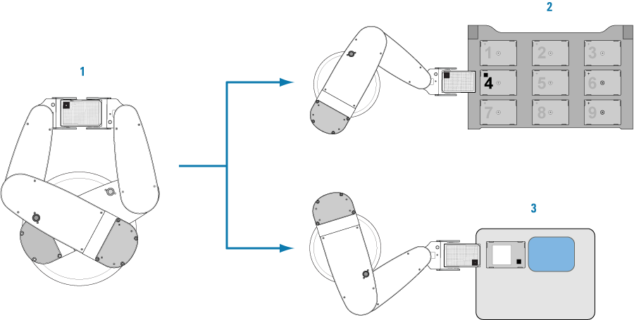 In the following example, the labware is placed at the platepad with the A1 well positioned as shown (1). If the next device requires the A1 well to be toward the grippers (2), the robot will use the left-arm orientation. However, if the next device requires the A1 well to be away from the grippers (3), the robot will use the right-arm orientation.