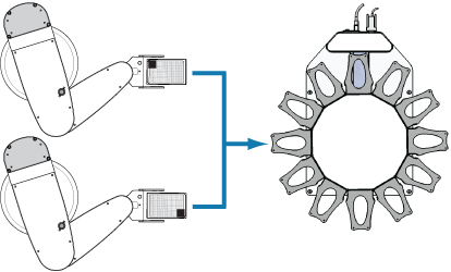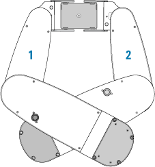 In the following example, there are no obstacles near the platepad in the portrait orientation. You can set the platepad teachpoint with the left- (1) and right-arm (2) orientations.