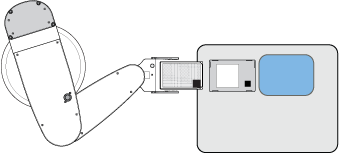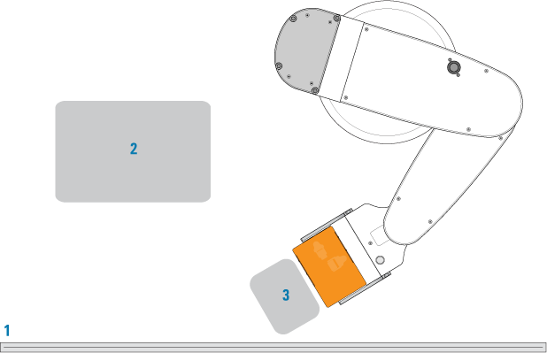 • Set Approach Distance at the smallest possible value. In general, rotating robot movements are faster than straight movements. To ensure that the robot rotates from the safe zone directly to the teachpoint approach height, set the Approach Distance at 0. If obstacles near or at the teachpoint does not permit the rotating movement, set the Approach Distance at the smallest possible value for the location. For more information, see Setting the approach distance.In the following example, the system window (1) and an adjacent device (2) are two obstacles near the desired location (3). Therefore, the left-arm orientation should be used when setting the teachpoint.
