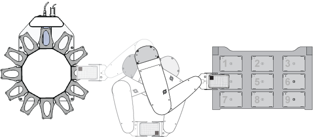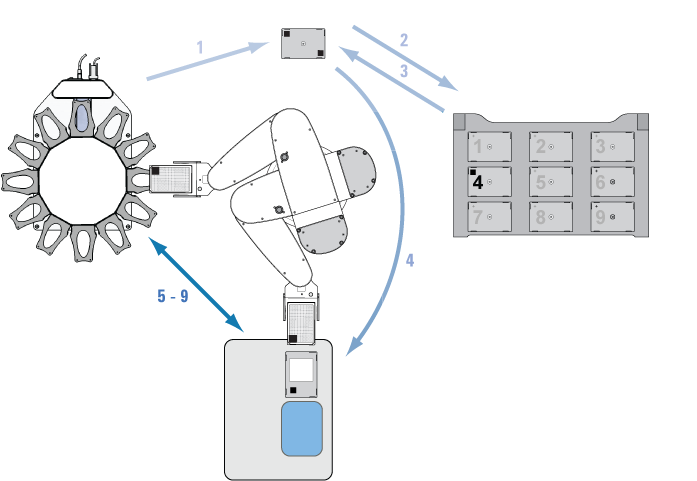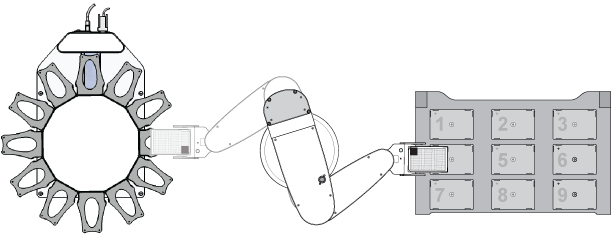 • The optimal teachpoint setup at the Plate Hub Carousel would require the least number of regrips as the labware is transferred between the three devices.If the Plate Hub Carousel teachpoint is set with the A1-away orientation, the robot must regrip as it moves labware from the Plate Hub Carousel to the Bravo deck (1, 2), and regrip again as it moves the labware from the Bravo deck to the dispenser (3, 4). Thereafter, the robot can move the labware between the dispenser and Plate Hub Carousel without regripping (5–9). So the total number of regrips in this scenario is two.