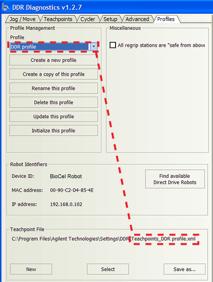 Every Direct Drive Robot profile must be associated with a teachpoint file. When you create a profile, the software automatically creates a new default teachpoint file. Its location is shown in the Teachpoint File area. The file name is teachpoint_<profilename>, and the file remains empty until you set teachpoints.