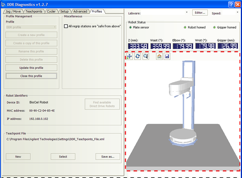Click Initialize this profile. In the Robot Status area, a graphical representation of the robot and teachpoints (if any) appear. In addition, the robot coordinates are updated.IMPORTANT The system table displayed in the Robot Status area should be representative of the actual system table. If no image appears, or if the dimensions in the image appears to be incorrect (for example, a rectangular table appears in the software but the actual system table is square), see Specifying the table dimensions and robot position.