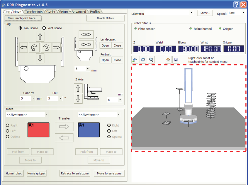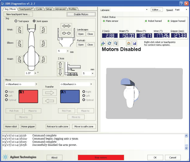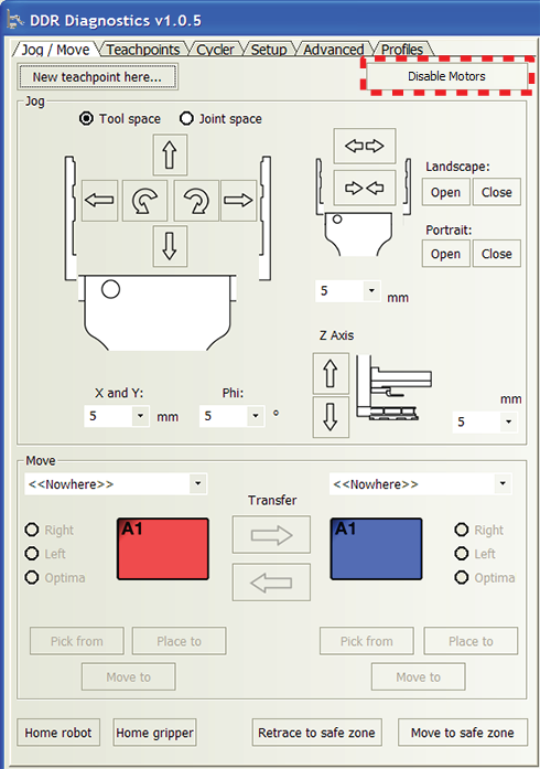 1 In Direct Drive Robot Diagnostics, click the Jog/Move tab, and then click Disable Motors. You should be able to rotate the robot waist and arm manually without resistance.