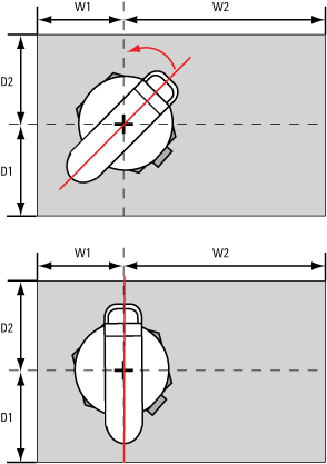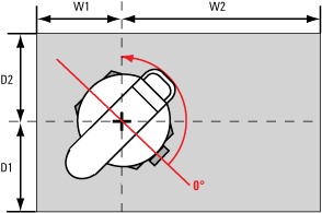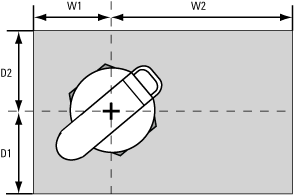 3 Click Save. The robot settings are saved in an XML file.Take the measurements that are shown in the following diagram. The crosshair symbol in the diagram marks the center of the robot. The W-axis is width of the robot-attachment surface. W1 and W2 specify the lengths of the two segments of the width. The line that intercepts the end of W1 and the beginning of W2 runs through the center of the robot base. The D-axis is the depth of the robot-attachment surface. D1 and D2 specify the lengths of the two segments of the depth. The line that intercepts the end of D1 and the beginning of D2 runs through the center of the robot base.