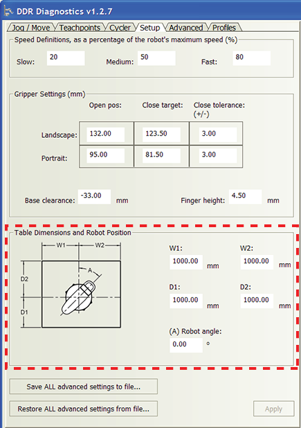 6 After you have verified that the table settings are correct, click Save ALL advanced settings to file. The values in the Setup tab are saved to an XML file. You can use the XML file to recover the settings if they are lost.