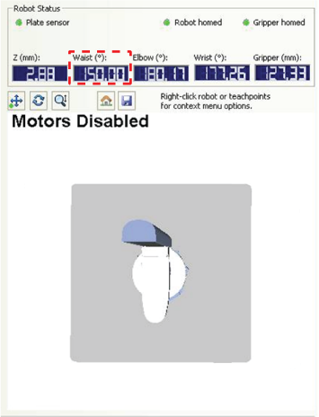 3 In Direct Drive Robot Diagnostics, note the Waist angle in the Robot Status area. This is the robot angle value you will use.