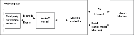 The following figure illustrates the use of the Labware MiniHub ActiveX control in a lab automation system environment. Actions you perform are conducted through ActiveX methods. System responses are relayed back through ActiveX events or through return values and variables passed to methods.