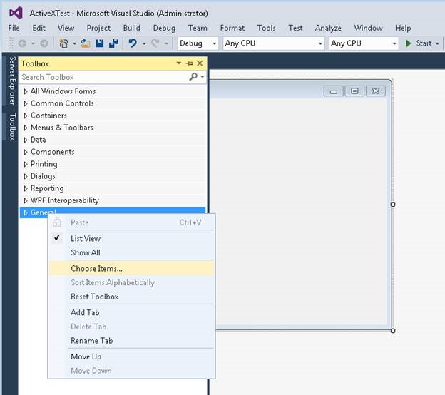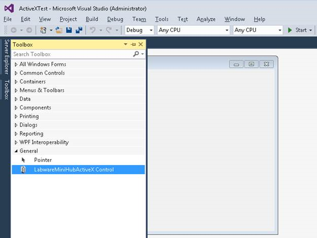 The Agilent ActiveX control is a Windows-based control. To use the control, you place it on a form or window. The form can be visible or hidden. The following procedure provides an example of how to set up the control using Microsoft Visual Studio.