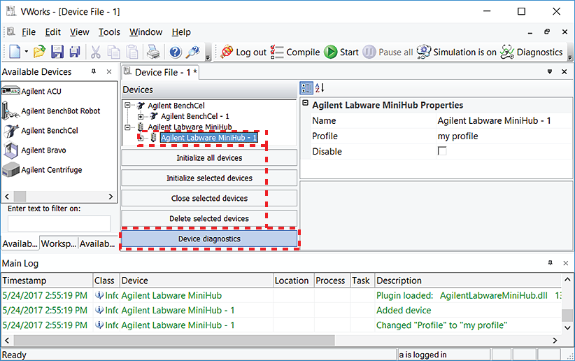 Opening Labware MiniHub DiagnosticsAccess to Labware MiniHub Diagnostics depends on the automation software you are using: VWorks software or third-party automation software.In the VWorks software Devices area, select the Labware MiniHub name, and then click Device diagnostics.