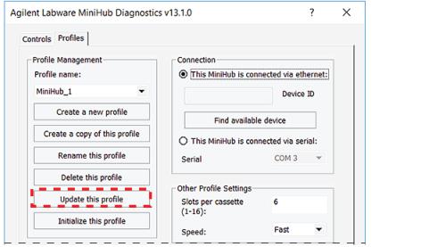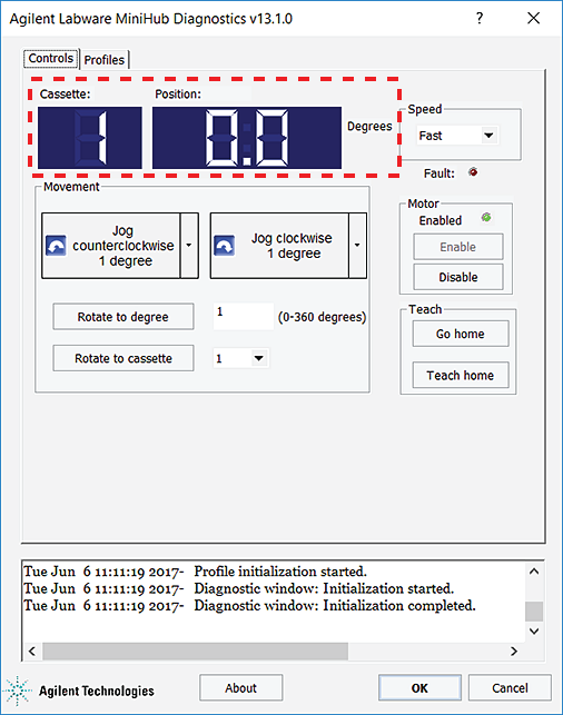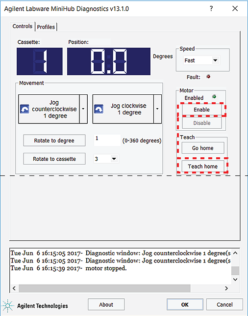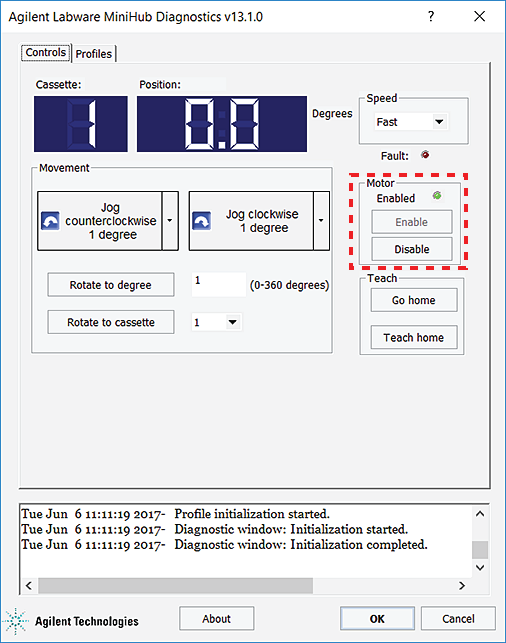 2 In Labware MiniHub Diagnostics, click the Controls tab, and then click Disable in the Motor area. You should be able to manually rotate the Labware MiniHub.