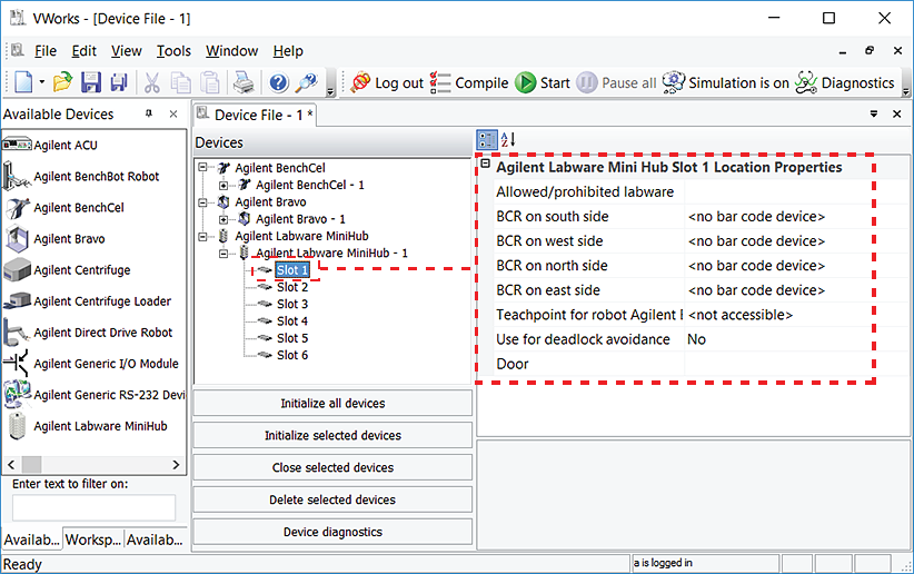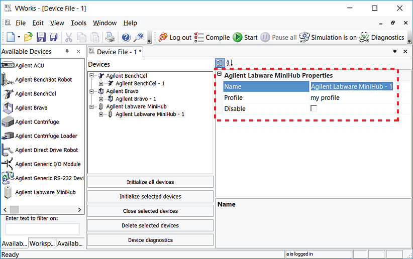 6 In the Device File area, select the Labware MiniHub, and then click Initialize selected devices to establish communication with the device.