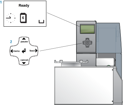 Agilent Automation Solutions Technical Support might request the device status information from you when troubleshooting the Microplate Labeler. This topic describes how to view the status information for the cab A2+ printer and how to return the printer to the Ready state.You may use the printer service display (figure, item 1) and the navigator pad (figure, item 2) to access the status menu.