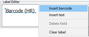 Available for field 2 only. Inserts a barcode field in the Label Editor preview box and adds a barcode field to the Label Field Data table.A pair of thin blue lines with arrows appear on the top and left sides of the barcode field in the preview box. The intersection of the blue lines represents the printer x, y coordinates for the field position on the label. A pair of thin blue lines with arrows appear on the bottom and left sides of the text field in the preview box. The intersection of the blue lines represents the printer x, y coordinates for the field position on the label.