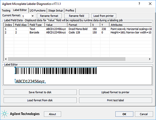 Label format templates are included with the Microplate Labeler. You can load the formats from the printer or from the computer. C:\VWorks Workspace\Microplate Labeler Label Formats C:\VWorks Workspace\Microplate Labeler Label FormatsNote: Only the label formats created for the cab A2+ printer are supported on the Microplate Labeler. Only the label formats stored in the printer are available for labeling protocols (VWorks software), or print-and-apply tests (Microplate Labeler Diagnostics).