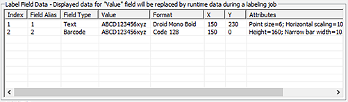 • Text/numeric field. The value is the actual text that will be printed during a test print.