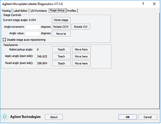This topic provides a quick reference to the controls and indicators in the Microplate Labeler Diagnostics—Stage Setup tab. The controls in the Stage Setup tab enable you to rotate the plate stage and to reset the plate stage angles (teachpoints) when setting up the device.Figure. Stage Setup tab