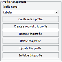 This topic provides a quick reference to the controls and indicators in the Microplate Labeler Diagnostics—Profiles tab. You use the controls in the Profiles tab to create or modify the device communication profiles and to initialize a profile to use while controlling the device from Microplate Labeler Diagnostics.Figure. Profiles tab