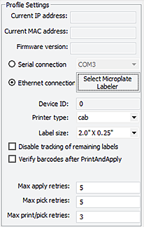 Ethernet connection only. When communication is established with the device using the given profile, displays the current IP address of the device. Ethernet connection only. When communication is established with the device using the given profile, displays the current MAC address of the device. Serial connection only. Specifies the serial port on the computer for serial communication with the Microplate Labeler. Ethernet connection only. Specifies an Ethernet connection for the Microplate Labeler. Displays the device ID for the Microplate Labeler after communication with the device is established. Opens the Discovered Bionet Devices dialog box where you can select the Microplate Labeler that you want to connect to using an Ethernet connection. Specifies the printer model. For the Microplate Labeler, make sure you select the cab printer. Available for optional barcode reader only. Verifies that every barcode label that is printed and applied can be read by the barcode reader.