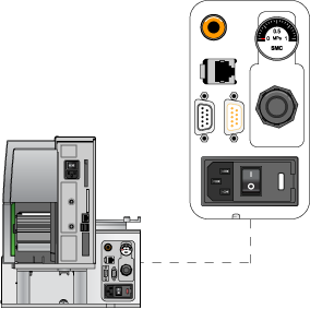1 Make sure that the point at which the detachable power cord is connected to the Microplate Labeler is clear from clutter and that it is accessible at all times.Figure. Microplate Labeler power entry (rear view)