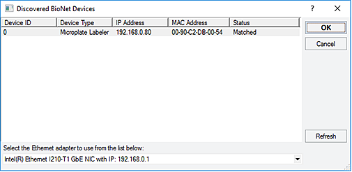 b In the list of devices that appear, select the Microplate Labeler device. If multiple Microplate Labeler devices are on the network, use the MAC Address to identify the Microplate Labeler device for this profile.To successfully communicate with the Microplate Labeler device, the Status column must display New or Matched.