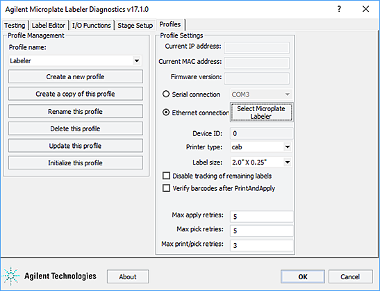 A profile contains the initialization settings associated with a particular device that are required for communication. Every Microplate Labeler on a given network requires its own profile.Figure. Microplate Labeler Diagnostics—Profiles tab