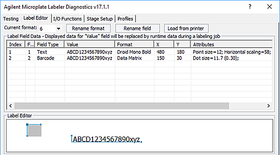 Template 6—Data Matrix symbology with large text field Example label Label Editor parameters and preview Overview The Data Matrix symbology (with this dot size) encodes roughly the same amount of data that can fit on a label with the Code 128 symbology. So, Template 6 is analogous to Template 1. Because the Data Matrix symbology is so much denser than the Code 128 symbology, the text field can be much larger than the corresponding one that is paired with Code 128 in Template 1. Specs Maximum data: 24 numerals or 16 alpha characters (The maximum alphanumeric length depends on the character mix.) Design features • Data Matrix is a very dense and popular 2D symbology. • The dot size used in this template is conservative for good readability. • Generous margins are provided on both the right and left of the barcode. • The blank margin above the barcode allows for 0.76‑mm (0.030‑in) vertical print drift. • The blank margin below the barcode will vary depending on the amount of data encoded. The example shows the maximum data length while still maintaining a 0.76‑mm (0.030‑in) bottom margin. • The barcode is positioned to the left of the text in the event that too much data is used for the text fields. In this case, the text will run off the right edge of the label and will not interfere with the barcode. • The Droid Mono Bold font offers consistent character spacing, discernible characters, and a modern look. • The font size is large to offer optimum legibility. • The text field is scaled horizontally so it can fit enough characters to match the data that can be encoded in the barcode. • The text field is left-justified to allow for the longest possible strings for the available space. • Generous space above and below the text allow for vertical print drift.