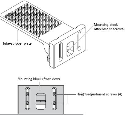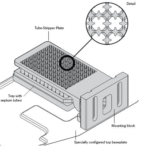 Setting up a Tube-Stripper Plate About this topic The Tube-Stripper Plate prevents septum tubes from adhering to the tips of a fixed-tip pipette head during pipetting tasks. This topic describes how to set up the Tube-Stripper Plate. Description The Tube-Stripper Plate is compatible with fixed-tip pipette heads. During a pipetting process, the shelf that contains a tray of septum tubes (shelf 7 or 8) moves into position under the Tube Stripper Plate. The pipette tips enter the tubes through the holes in the Tube-Stripper Plate. When the pipette head lifts up, the Tube-Stripper Plate holds the tubes in place in the tray. The tip holes in the Tube-Stripper Plate are arranged in a pattern that enables compatibility with both 96- and 384-tip pipette heads. See the figure detail. For a 96-tip pipette head, the tip goes through the center of the hole. For a 384-tip pipette head, each tip in a set of four goes through each of the four semicircles in the pattern. Before you begin The Tube-Stripper Plate requires a specially configured Vertical Pipetting Station top baseplate. CAUTION Before you install the Tube-Stripper Plate, verify that the teachpoints for shelves 7 and 8 are accurate. Setting up the Tube-Stripper Plate To set up a Tube-Stripper Plate: 1 Position the mounting block above the two screw holes on the front center of the Vertical Pipetting Station top baseplate between shelves 7 and 8. 2 Secure the mounting block to the top baseplate using the two hex-head screws provided. 3 While holding the Tube-Stripper Plate in position against the back of the mounting block, insert the four height-adjustment screws through the vertical slots in the front of the mounting block. Use two screws in each vertical slot. 4 Check the clearance above and below the Tube-Stripper Plate to determine whether a height adjustment is required. Verify the following: • Shelves 5 and 6 can move in and out above the Tube-Stripper Plate. • A plate loaded with septum tubes on shelf 7 or 8 can move into position under the Tube-Stripper Plate. 5 To adjust the height of the Tube-Stripper Plate: a Use a hex wrench to loosen the four adjustment screws on the front of the mount, and slide the Tube-Stripper Plate up or down as required. b At the desired height, tighten the four adjustment screws. Related topics For information about… See… Editing teachpoints Setting shelf teachpoints Using the accessory in a protocol VWorks Automation Control User Guide Other accessories Accessories overview