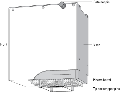 The disposable-tip pipette heads have four stripper pins that prevent the tip box from raising off the shelf when tips are being applied.However, you can retract the stripper pins to perform a task where the pins will interfere. For example, you should retract the stripper pins when you teach a tip box shelf.Figure. Pipette head components