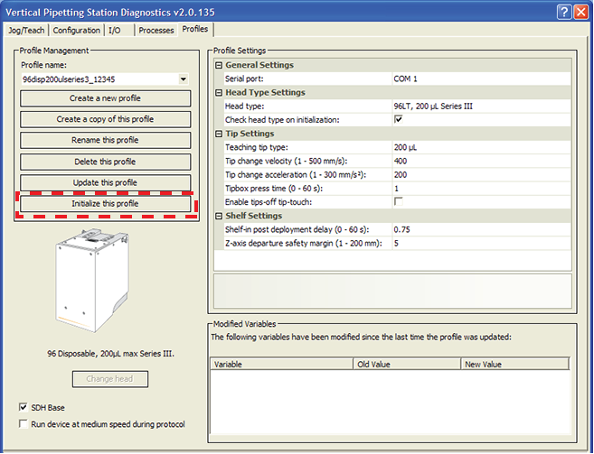 • In the Vertical Pipetting Station Diagnostics Profiles tab, initialize the profile