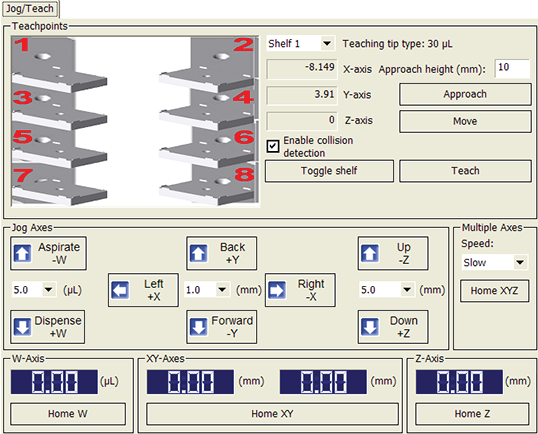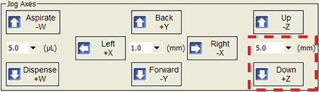 10 Under Jog Axes, use the controls to jog the pipette head down to the teachpoint position as follows: