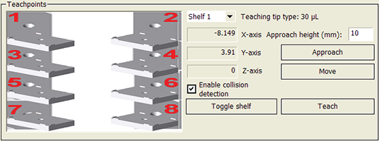 CAUTION This topic is appropriate for lab managers, administrators, or technicians (advanced users). Setting a teachpoint incorrectly can damage the Vertical Pipetting Station.A teachpoint is the x‑, y‑, and z‑axes coordinates that the pipette head moves to when the left-front tip (A1 position for a 96‑well plate) is over the shelf index point and almost touching the surface of the shelf.