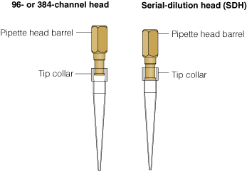 • Serial-dilution pipette heads (SDH). The pipette head barrels should be all the way down into the tip collars.